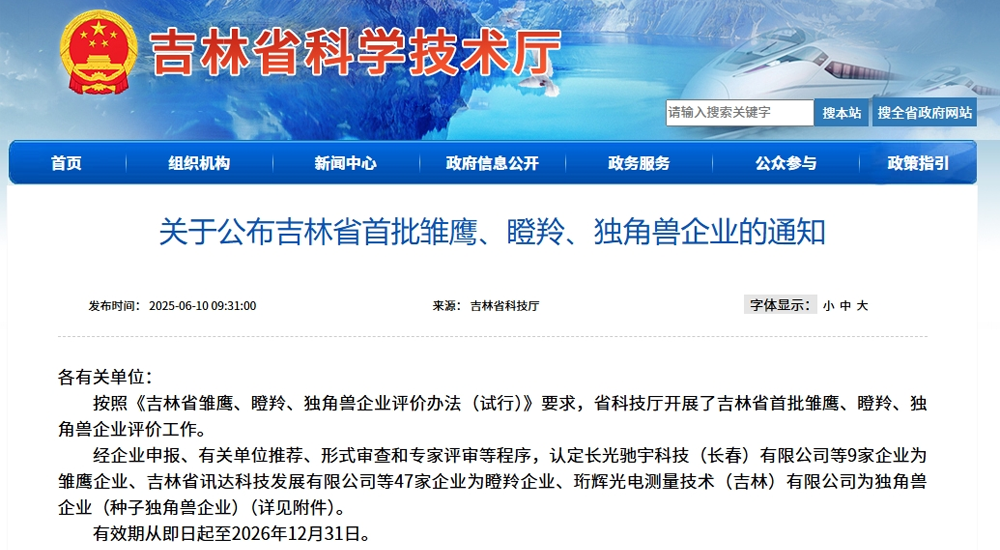 2025年6月10日,吉林省科學(xué)技術(shù)廳公布了吉林省首批雛鷹、瞪羚、獨(dú)角獸企業(yè)名單。吉林中科研伸科技有限公司憑借卓越的創(chuàng)新實(shí)力與爆發(fā)式的成長(zhǎng)速度,成功躋身吉林省首批“瞪羚企業(yè)”行列!