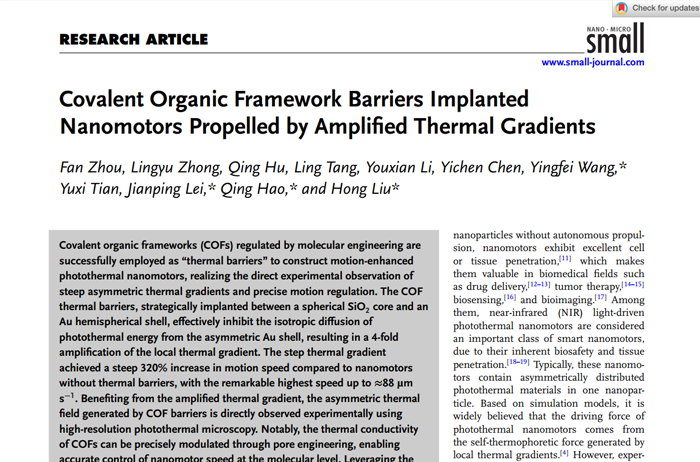 Covalent Organic Framework Barriers Implanted Nanomotors Propelled by Ampli?ed Thermal Gradients